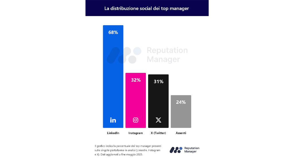 - Il 76% dei top manager è presente sui social – A maggio 2025, il 24% degli oltre 190 executive non appare sulle piattaforme social con un profilo personale. Il 68% ha un profilo LinkedIn, il 32% è presente su Instagram e il 31% presidia X.